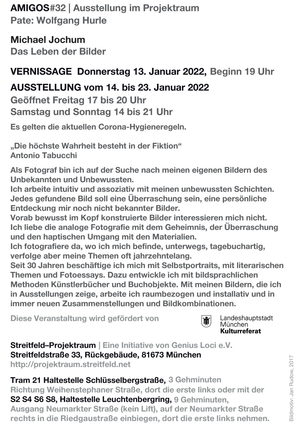 AMIGOS#32 Film und Gespräch zur Ausstellung:  Michael Jochum Eröffnung Donnerstag 13.1.2022 ab 19 Uhr Ausstellung 14.1. bis 23.1.2022 Öffnung: Freitag 17 bis 20 Uhr Samstag und Sonntag 14 bis 21 Uhr Streitfeldstraße 33, Rückgebäude, 81673 München http://projektraum.streitfeld.net Tram 21 Haltestelle Schlüsselbergstraße, 3 Gehminuten Richtung Weihenstephaner Straße, dort die erste links [...]