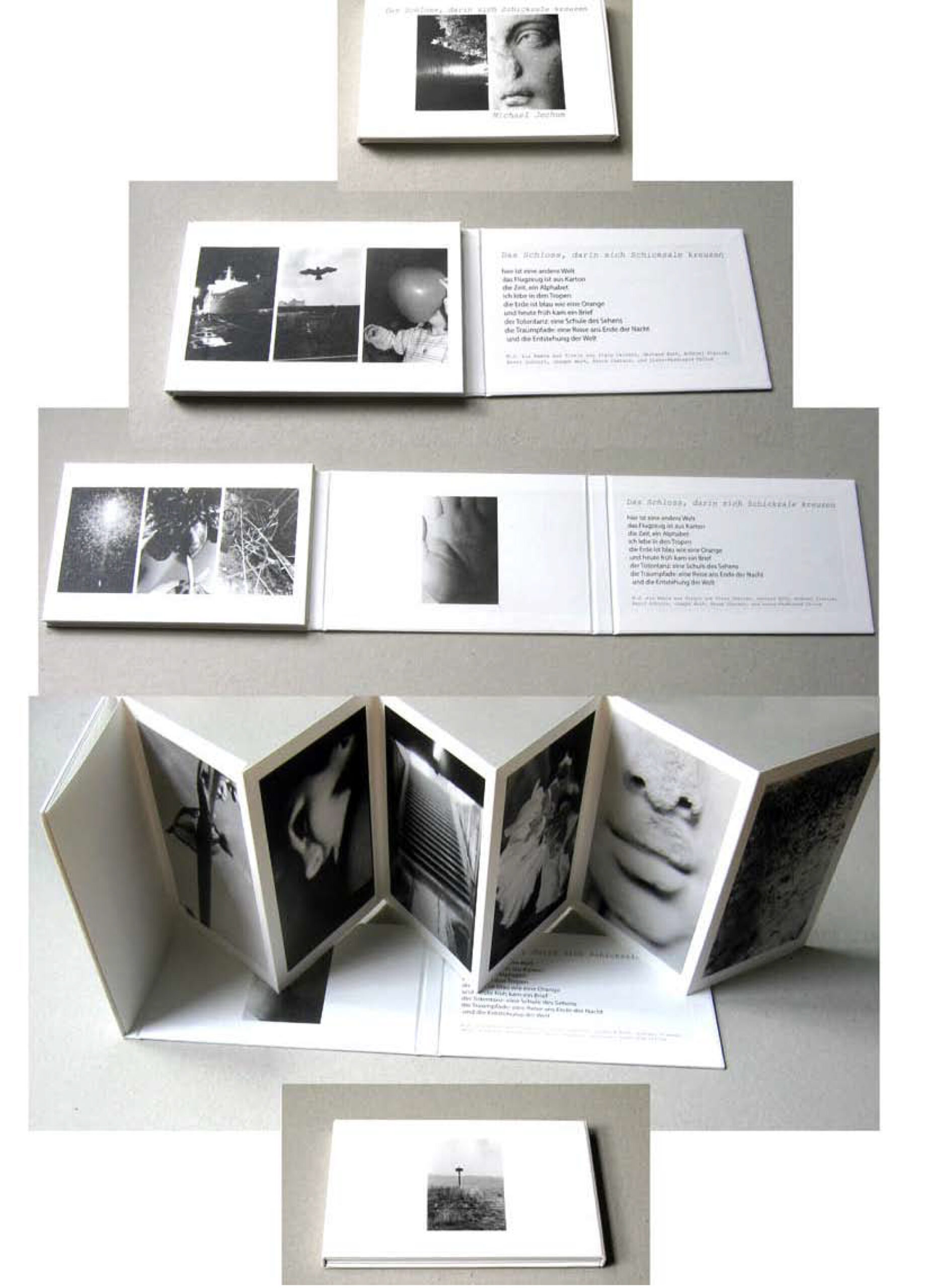 Michael Jochum „Das Schloß,darin sich Schicksale kreuzen“, Künstlerbuchobjekt, 2014 , mit eingelegter Originalfotografie, Digitaldruck, 16 s-w Fotografien und Remix aus literarischen Titeln, 10x16 cm, offen 10x51 cm, Auflage 14+2a, mit Originalfotografie 16x10cm Nr. 1 bis 6 ist Teil des Gruppenbuchobjekts von 25 Künstlern : „Ist dieser Wasserfall an Bildern wirklich [...]